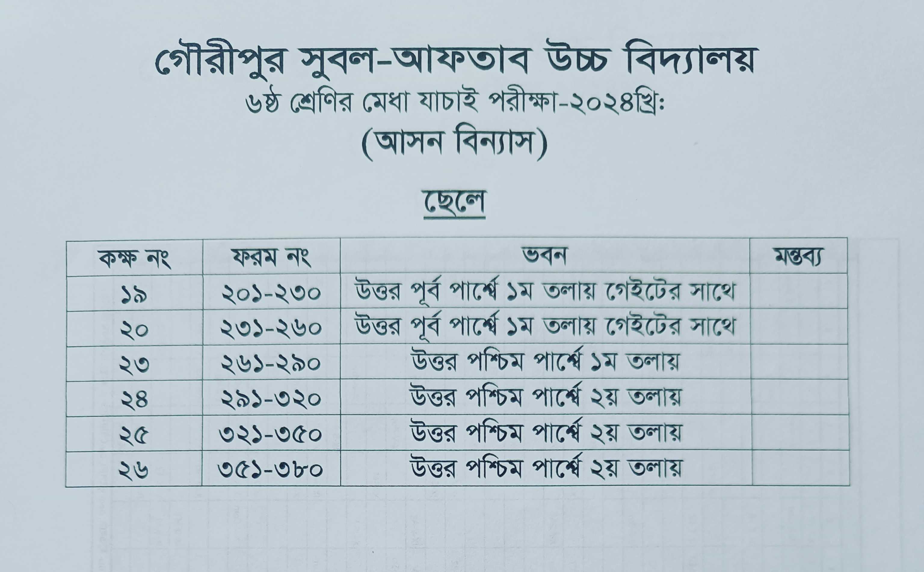 ৬ষ্ঠ শ্রেণির মেধা যাচাই পরীক্ষার আসন বিন্যাস (ছেলে)