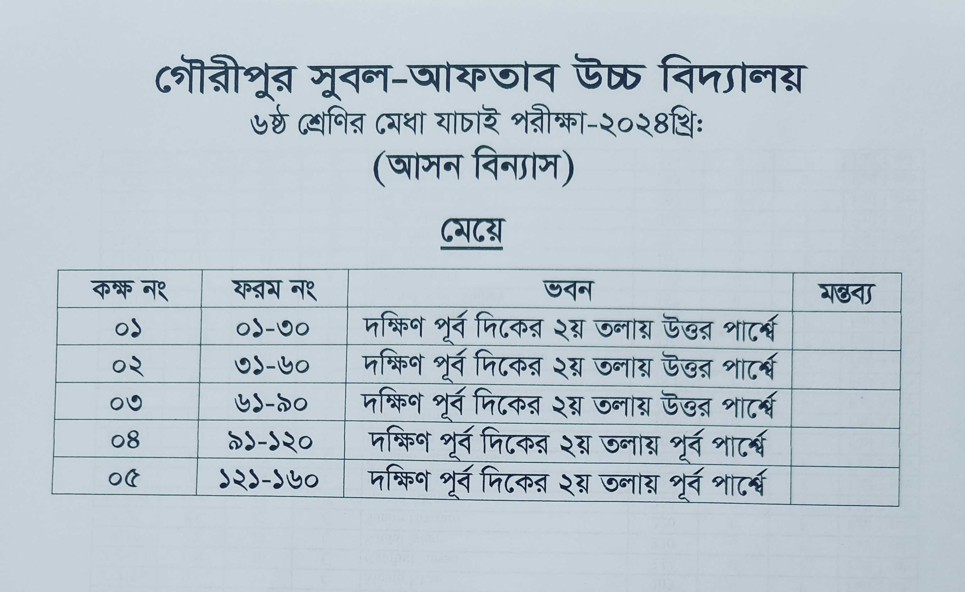 ৬ষ্ঠ শ্রেণির মেধা যাচাই পরীক্ষার আসন বিন্যাস (মেয়ে)
